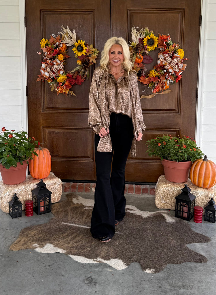 Elevate your wardrobe with this striking metallic snake print blouse, designed to make a sophisticated statement. The eye-catching serpentine pattern catches the light beautifully, while the charming tie neckline adds an elegant focal point. Voluminous bubble sleeves create a contemporary silhouette, finished with fitted cuffs at the wrist for polished definition. Crafted from 100% polyester, this blouse offers easy care and lasting durability. Perfect for transitioning from office to evening occasions with effortless style.
