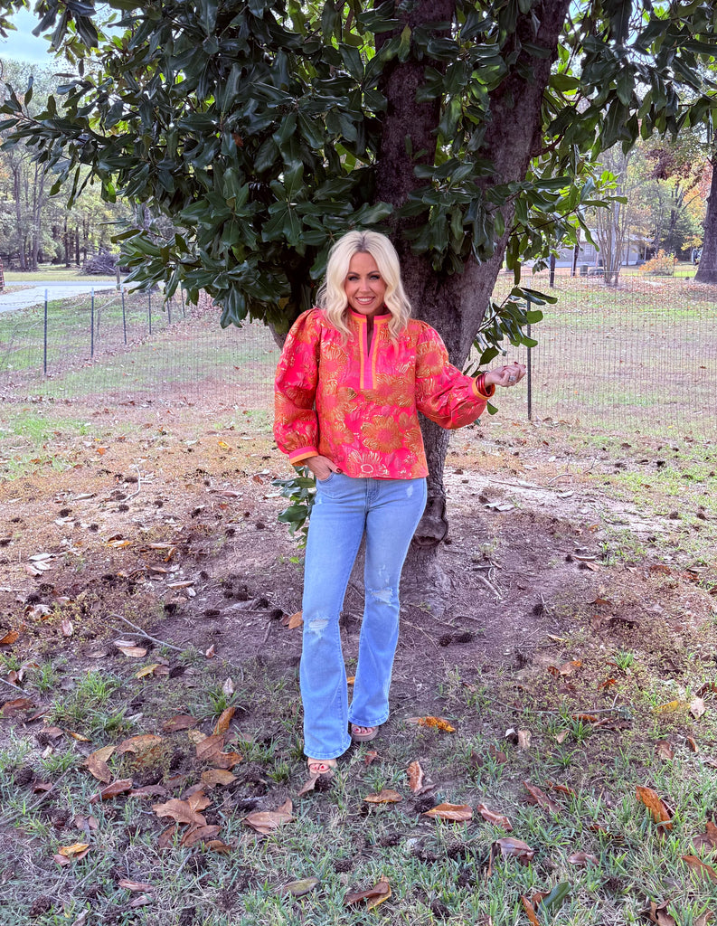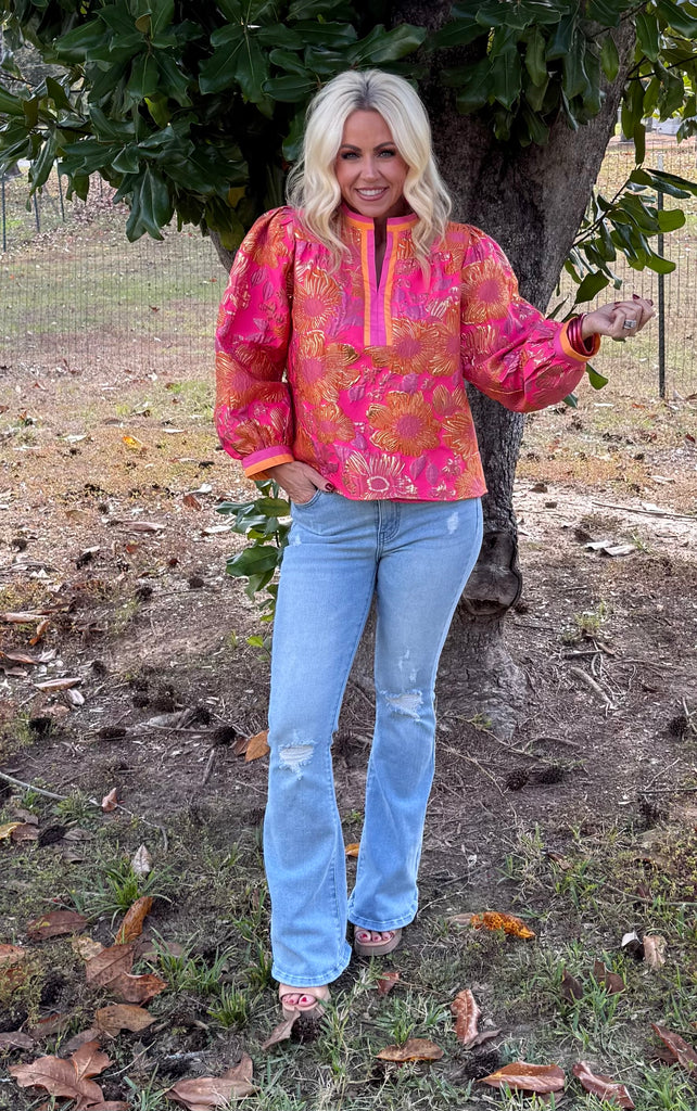Elevate your wardrobe with this striking jacquard top, where vibrant neon pink, orange, and gold hues converge in an intricate floral pattern. The contrast trim frames the neckline and cuffs with precision, while voluminous puff sleeves add contemporary flair and dimension. This piece bridges boho sophistication with modern edge—perfect for layering or wearing as a statement standalone. The jacquard construction ensures durability and visual depth that photographs beautifully.